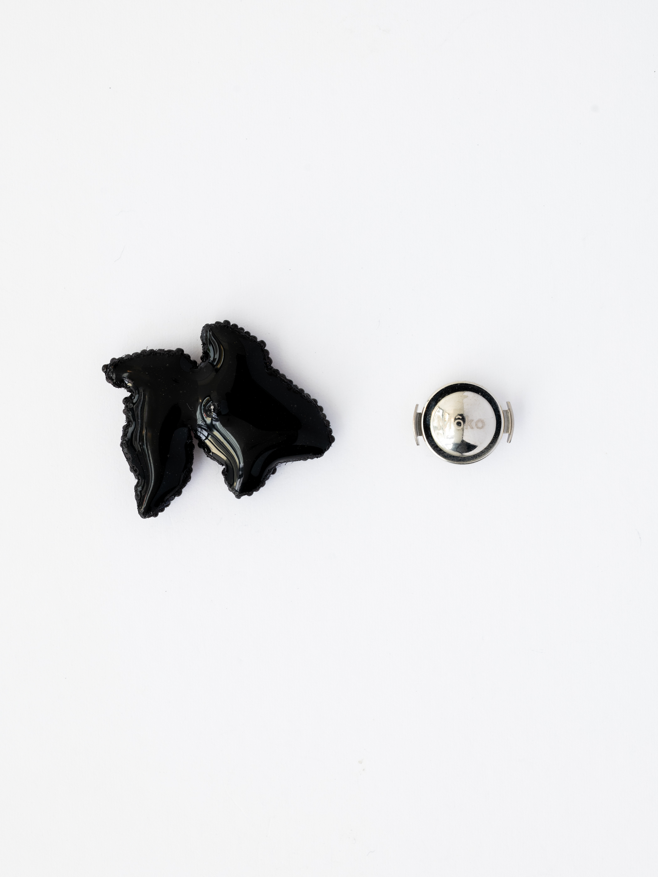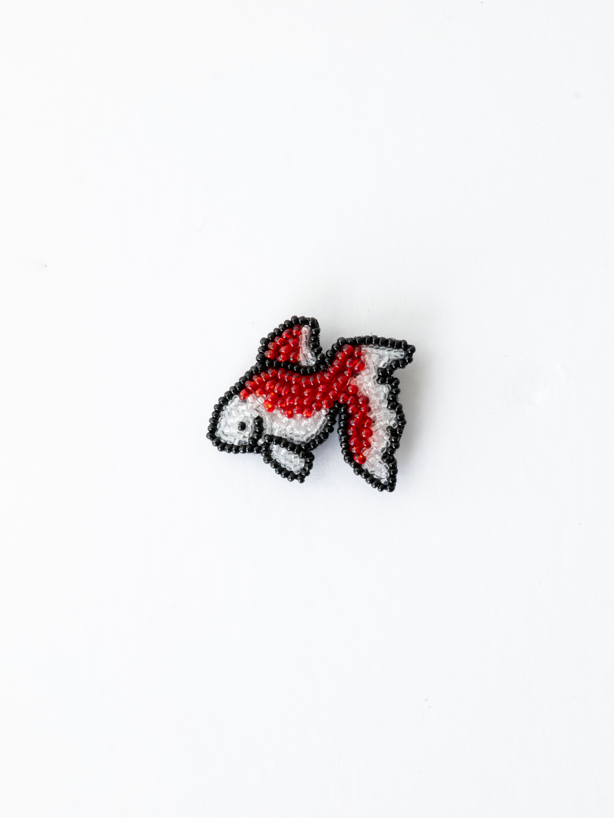 金魚のヒラヒラとした尾鰭が可愛らしい、さりげなくコーディネートの差し色になる鮮やかな赤色が素敵なピンブローチです。