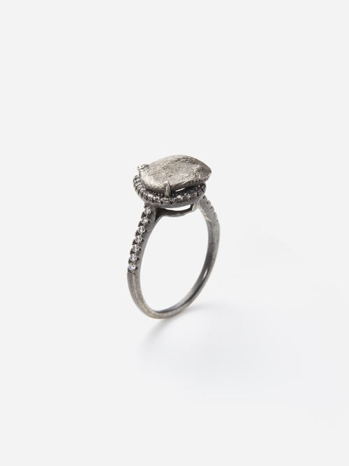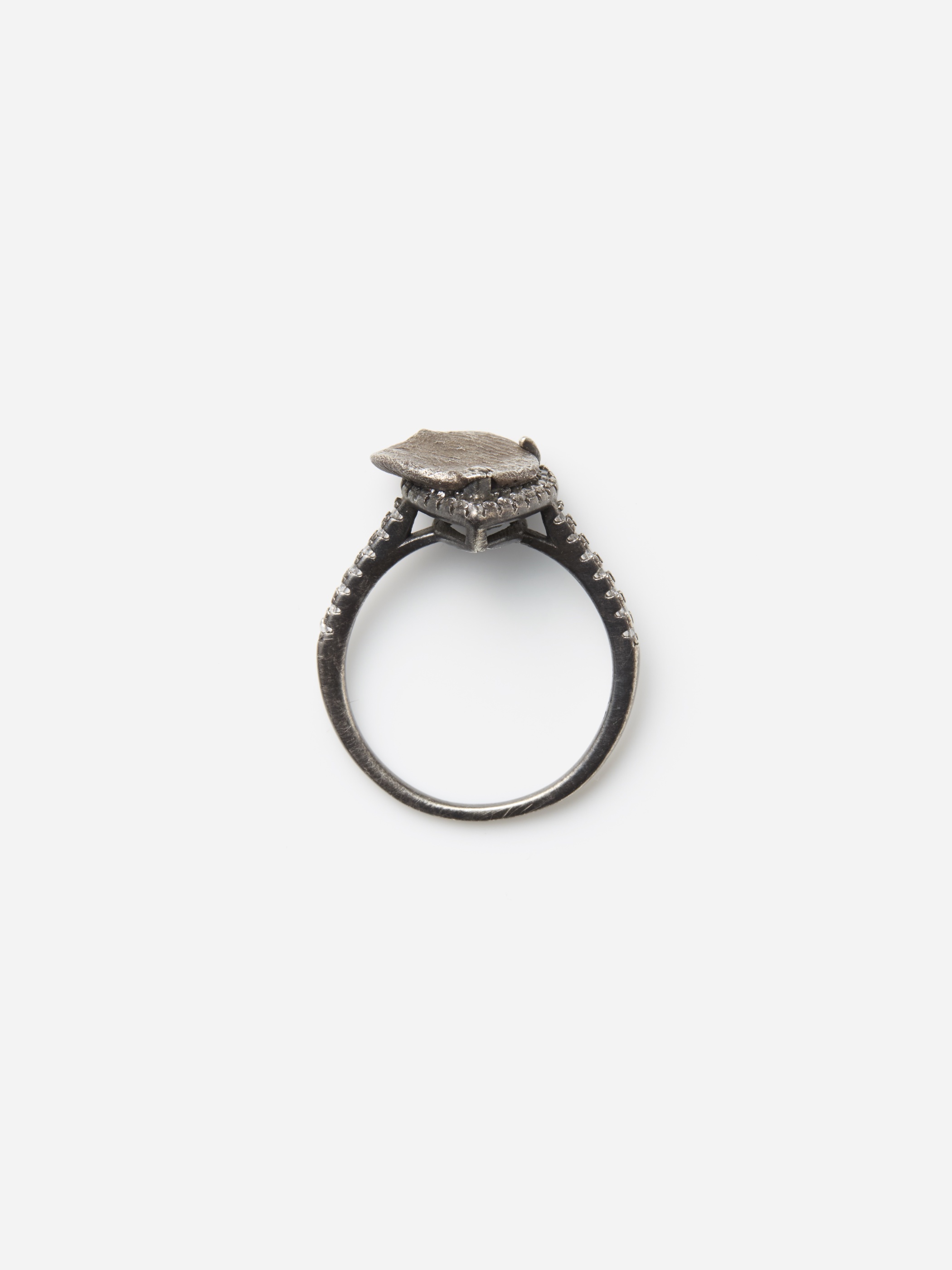 ドロップモチーフのアンティークリングを土台に、ワックスを手びねりし原型を作ったシルバーのパーツを組み合わせた、カール・フリッチらしいバランス感覚が光る一本。キュービックジルコニアがあしらわれた甘さのあるデザインに、真逆とも言える指紋をくっきり残したラフな要素がoxidized silverの色調で自然と融合し、シックな印象に仕上がりました。