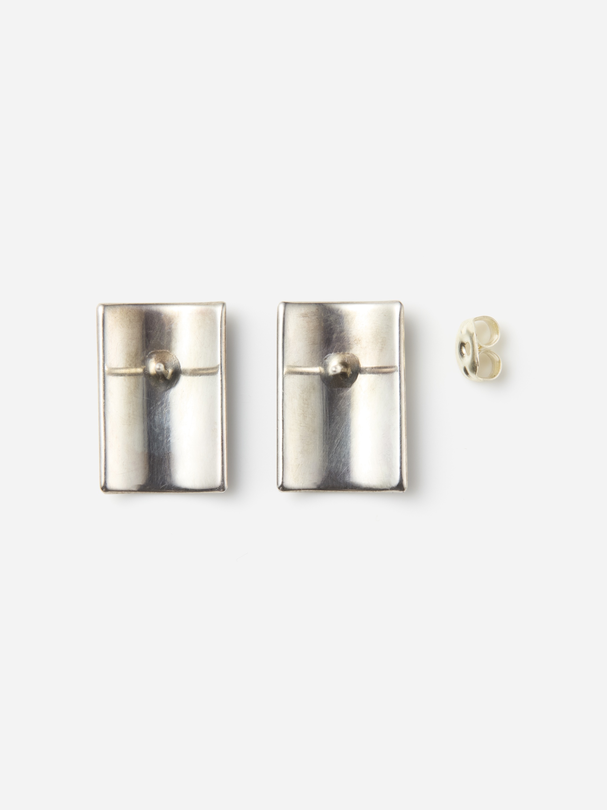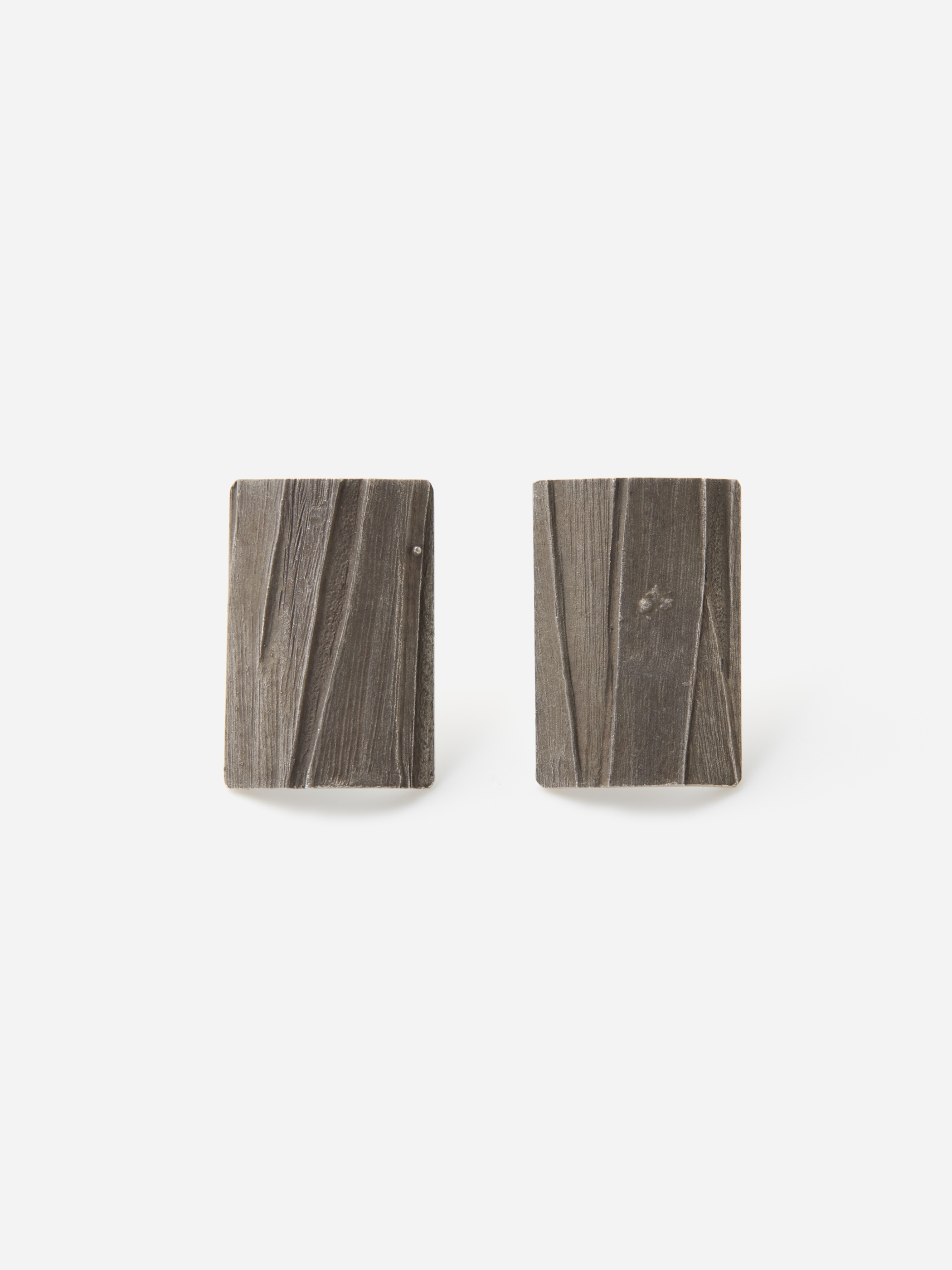 本物の木と見紛うようなリアリティがユニークなピアスは、ディテールは具象的でありながら全体のフォルムを潔いスクエアにすることで抽象的な要素も加わり、モダンな印象に仕上がっています。鉄を打ち出して樹皮の陰影をあらわした表面に対して裏面はシルバーで美しく仕立てられ、大人のための遊び心のあるジュエリー。