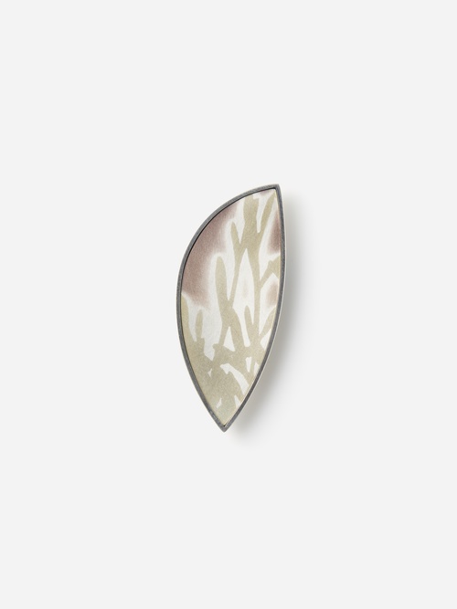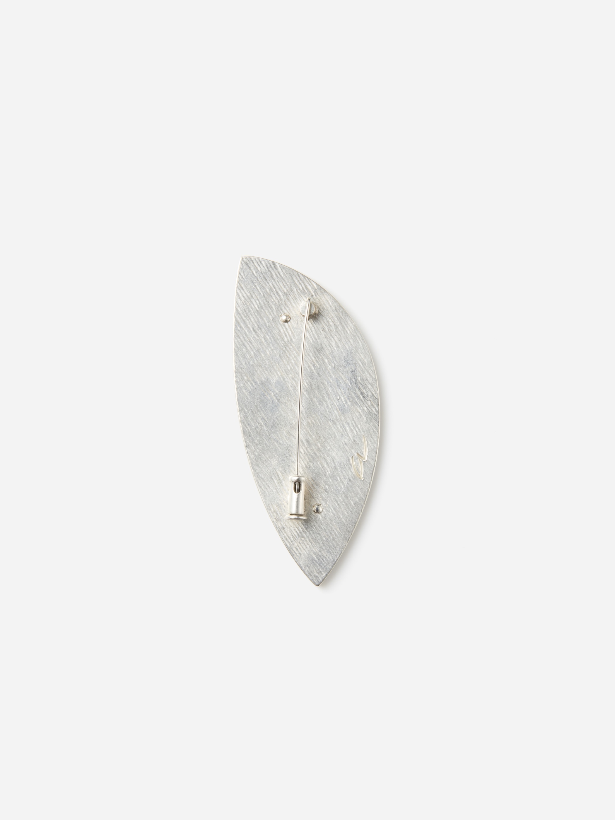 刻々とうつろう光と影の一瞬を写真やスケッチに収め、そこから形を選び取り、切り嵌め象嵌という手法で作られたブローチ。