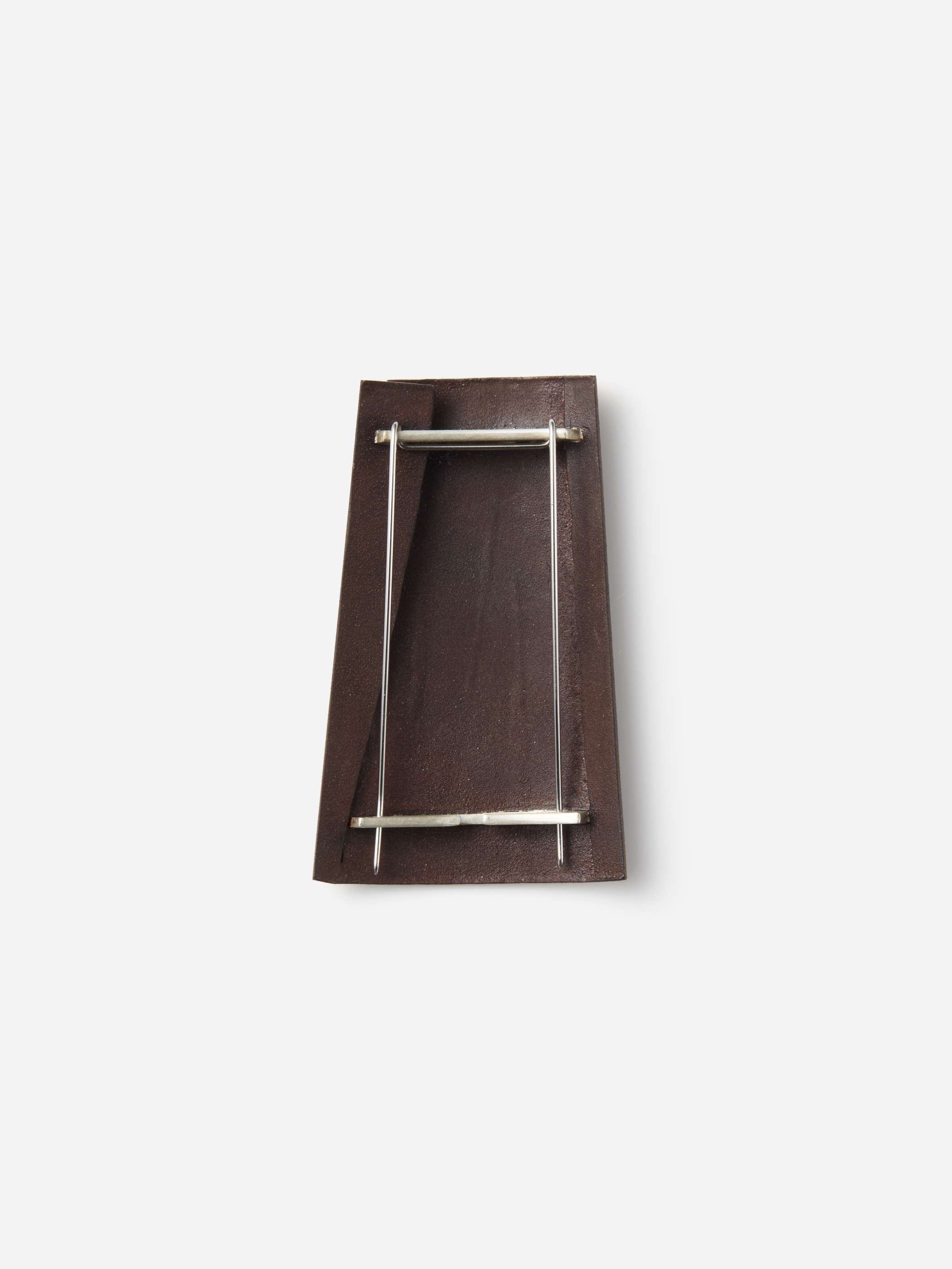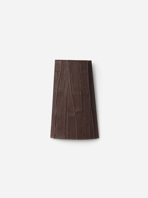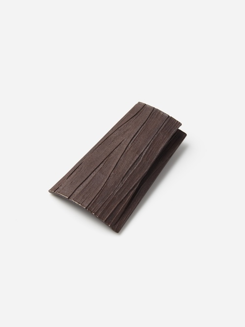 樹皮の表面に宿る陰影をモチーフに、繊細な凹凸で表現した鉄のブローチは、ディテールはきわめて具象的でありながら全体のフォルムは潔い台形で抽象化することでモダンな印象に導いています。