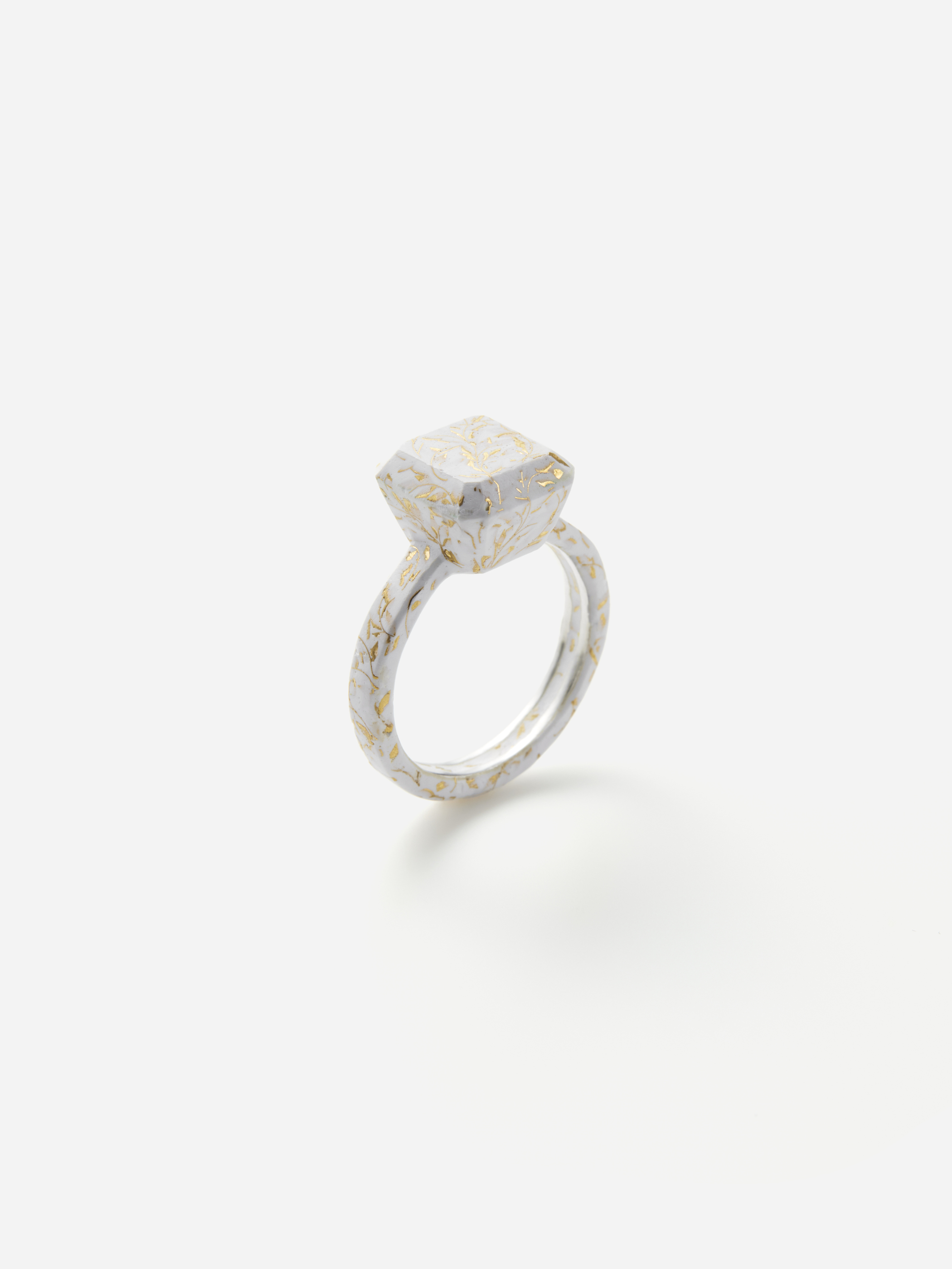 時が静止したかのように白と装飾で包み込まれたリングはまるでアートピースのような存在感です。工芸の緻密な手仕事を、軽やかにモードに表現するMari Kobayashiらしいジュエリーは必見です。
