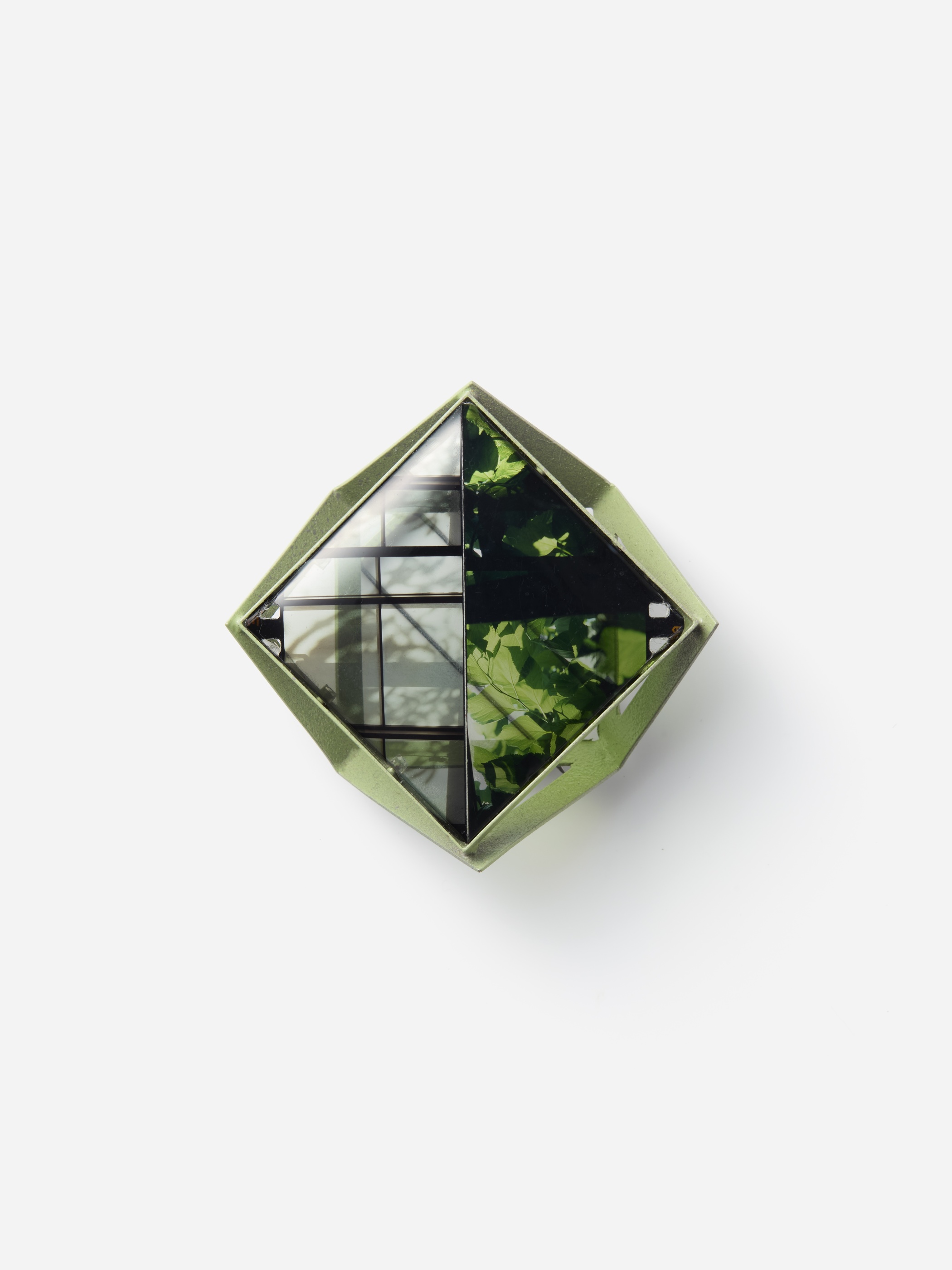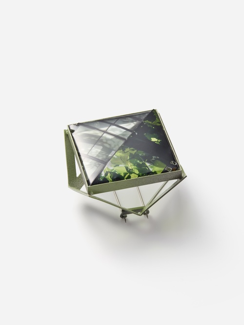 素材や手法の枠にとらわれない実験的で存在感のあるジュエリーを作り続けているRitsuko Oguraによる新作のひとつ、「inside outside」。風景が映し出されたポジフィルムとシルバーのフレームによって構成されたブローチです。片側には初夏の日に窓からのぞく桑の木、もう片方には障子内窓に写るその桑の木のシルエットが焼き付いています。二つの風景に交差する目線から時間や空間の広がりが感じられるようなポエティックな作品。