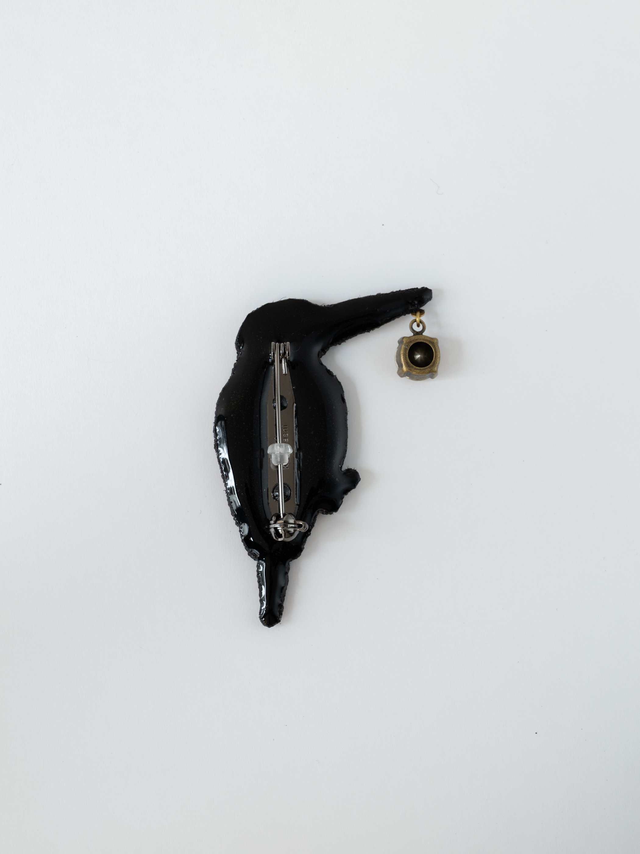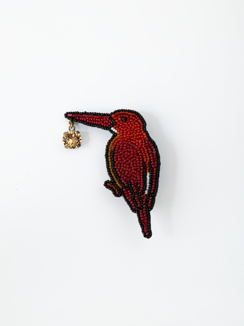カワセミ科に分類される「アカショウビン」をモチーフにしたブローチ。赤系統のビーズによるコントラストが美しい作品です。