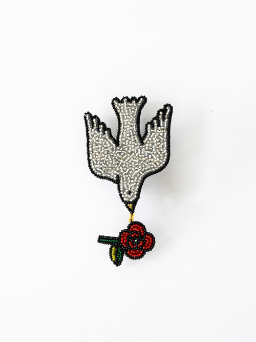 プレゼントの薔薇を加えた姿が可愛らしい「プレゼント」シリーズのハトのブローチ。少し斜めに角度をつけるような着け方も◎