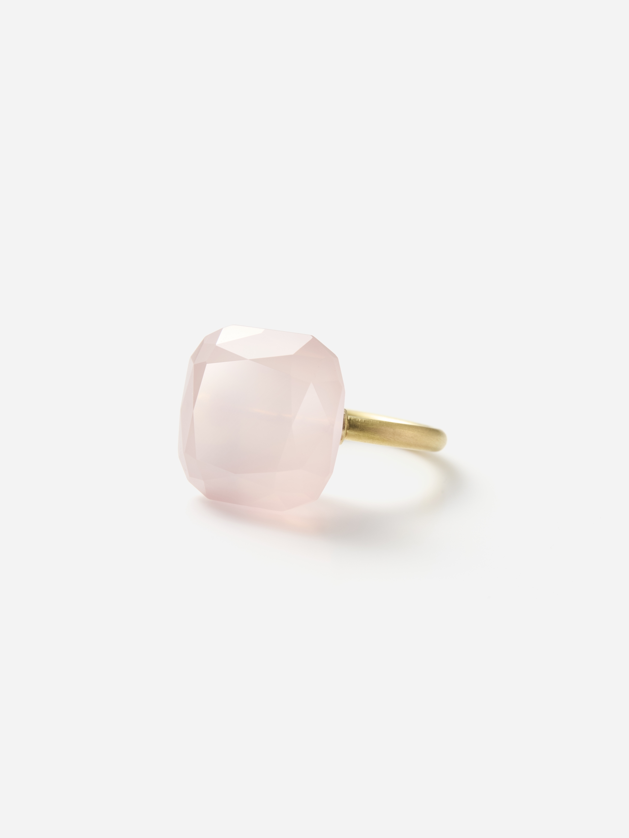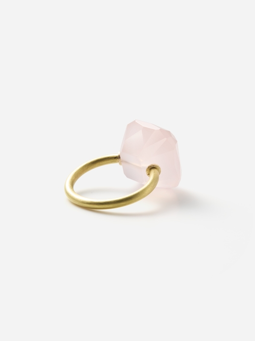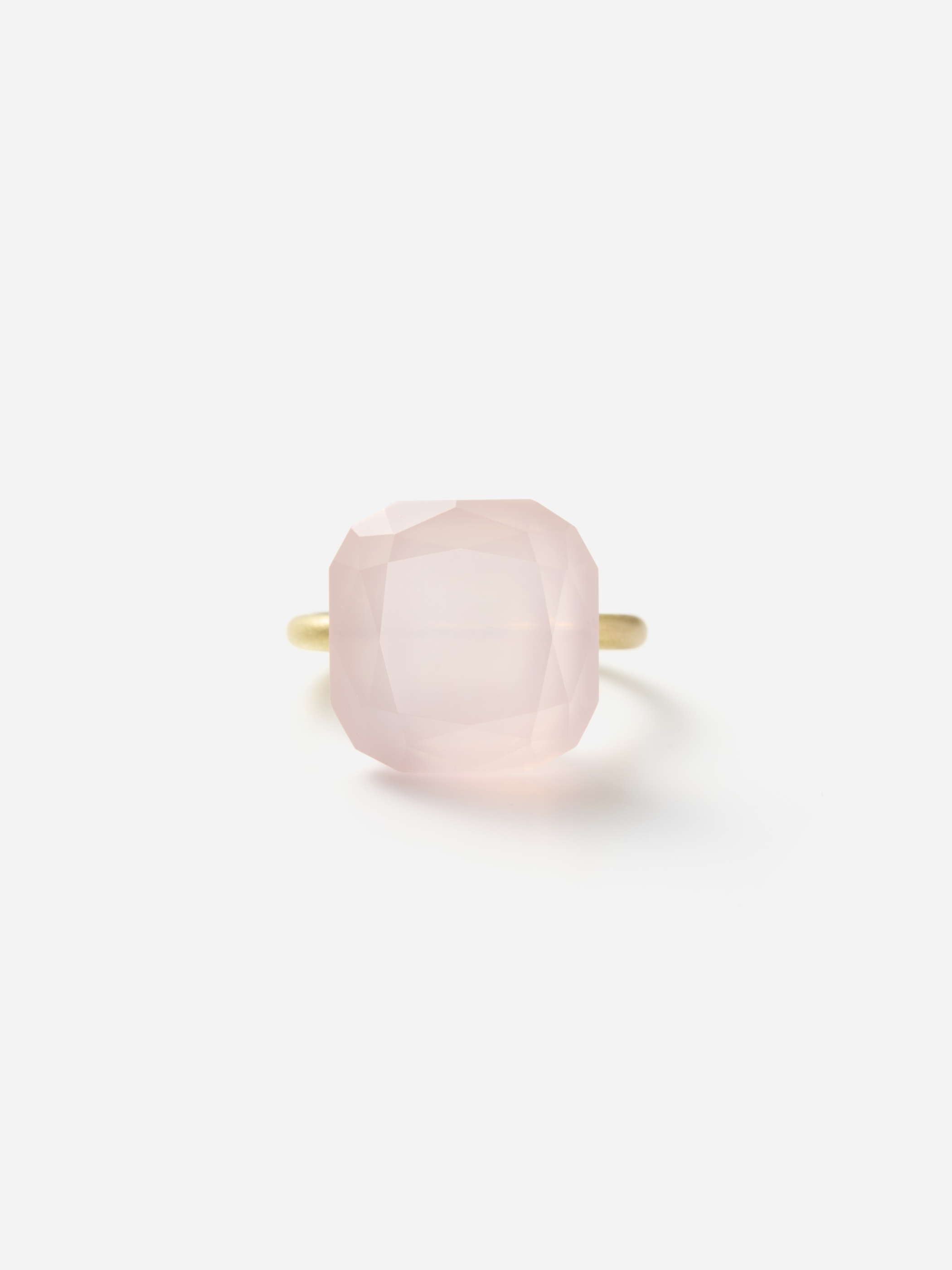 花びらのような淡いピンク色が魅力的なローズクォーツ。天然石の魅力を最大限に生かすカットとシンプルなセッティング、肌なじみの良いK20YGとの組み合わせによって構成された、ロングセラーであるEtsuko Sonobeの定番リングの一つです。