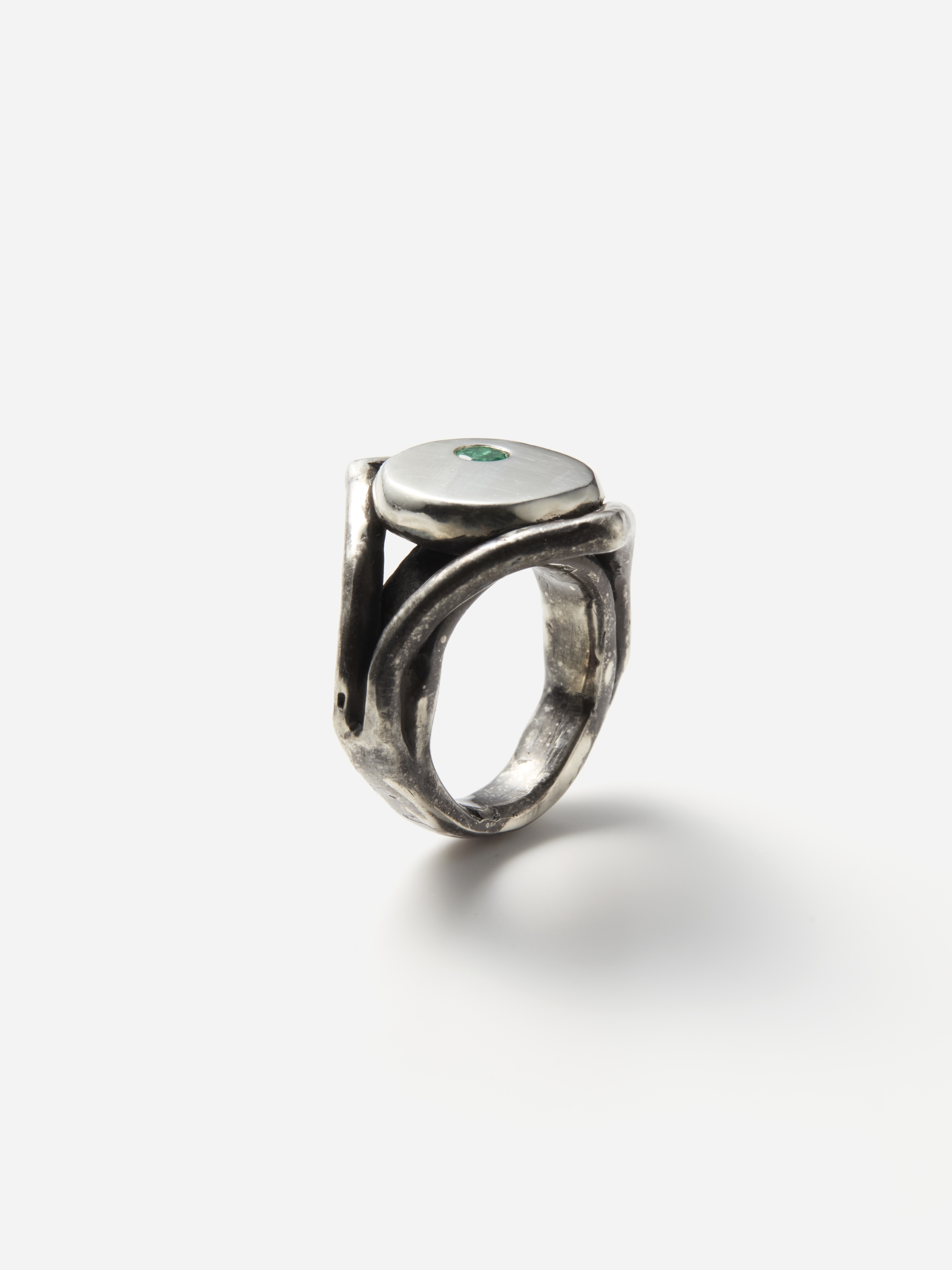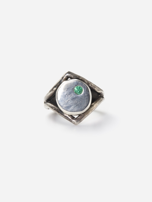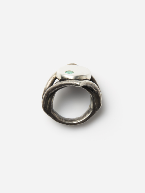 マックス・ウォーカーによるロストワックス鋳造法で作られたリング。手びねり成形ならではのゴツゴツとした風合いを残したアームときれいに整えられたトップとの対比が印象的で、シルバーの多面的な表情を引き出しています。小さいながらもエメラルドのグリーンが目を惹きます。夏の日差しやラフな装いにも映えそうな存在感のある一点です。