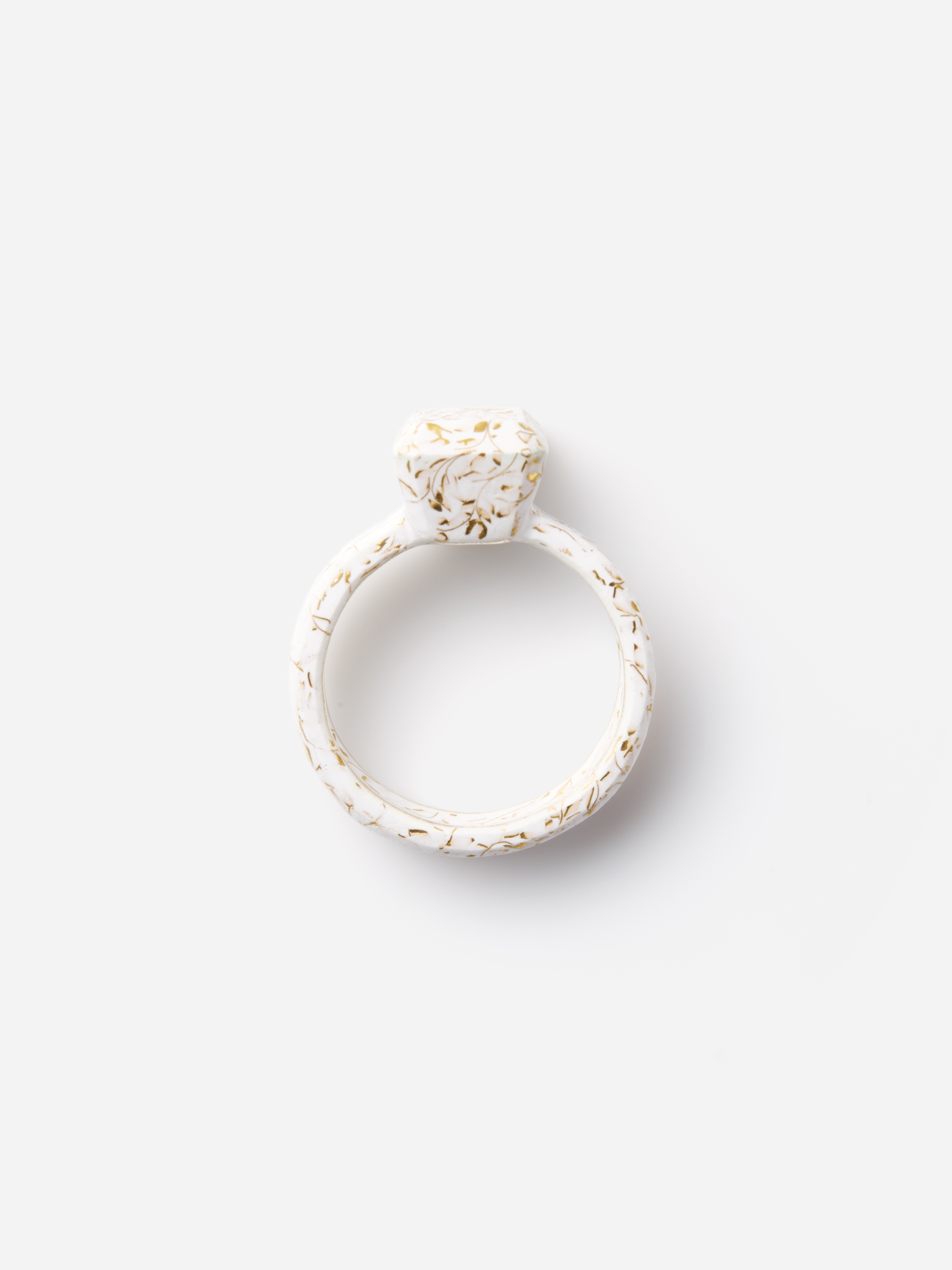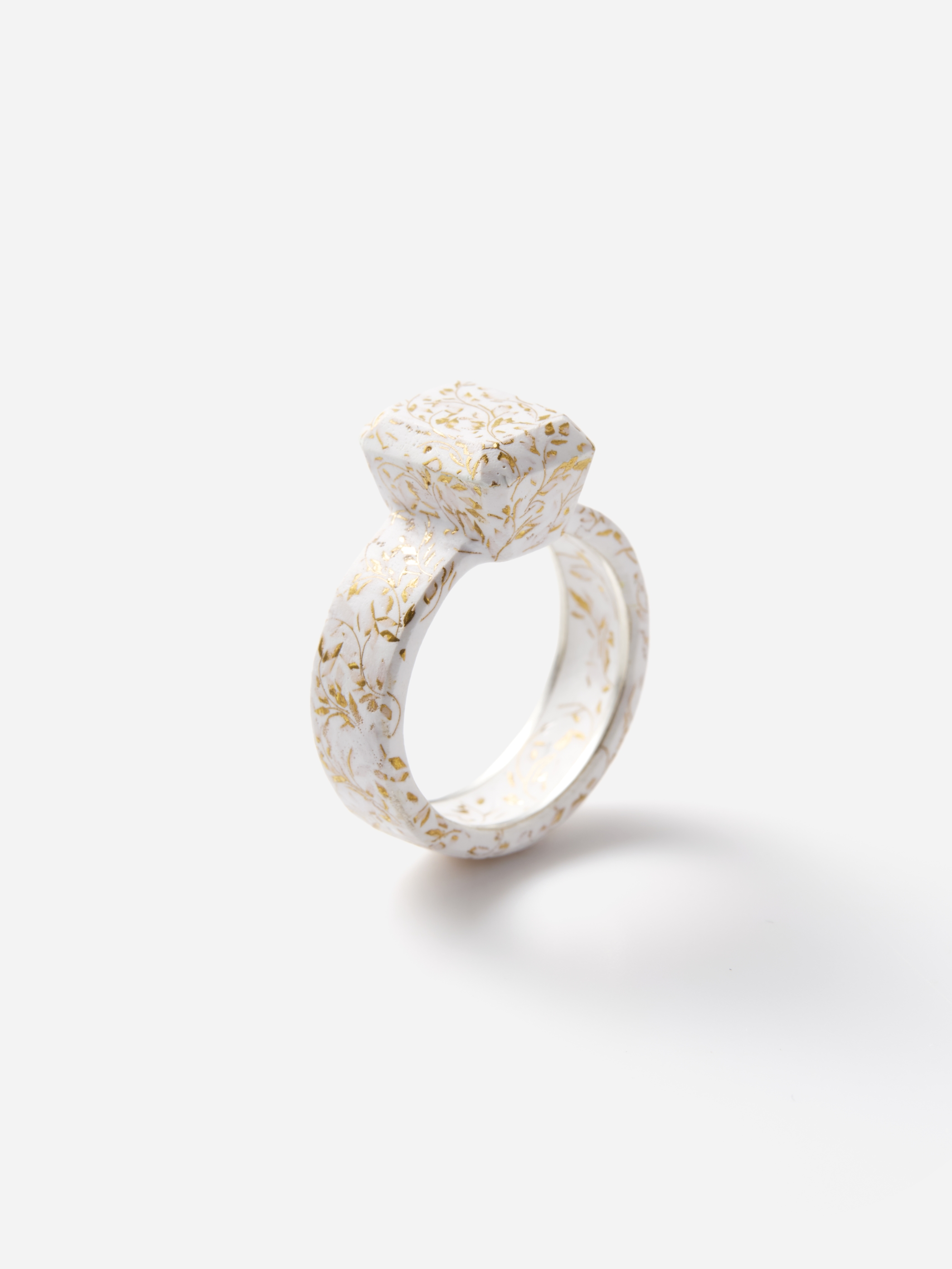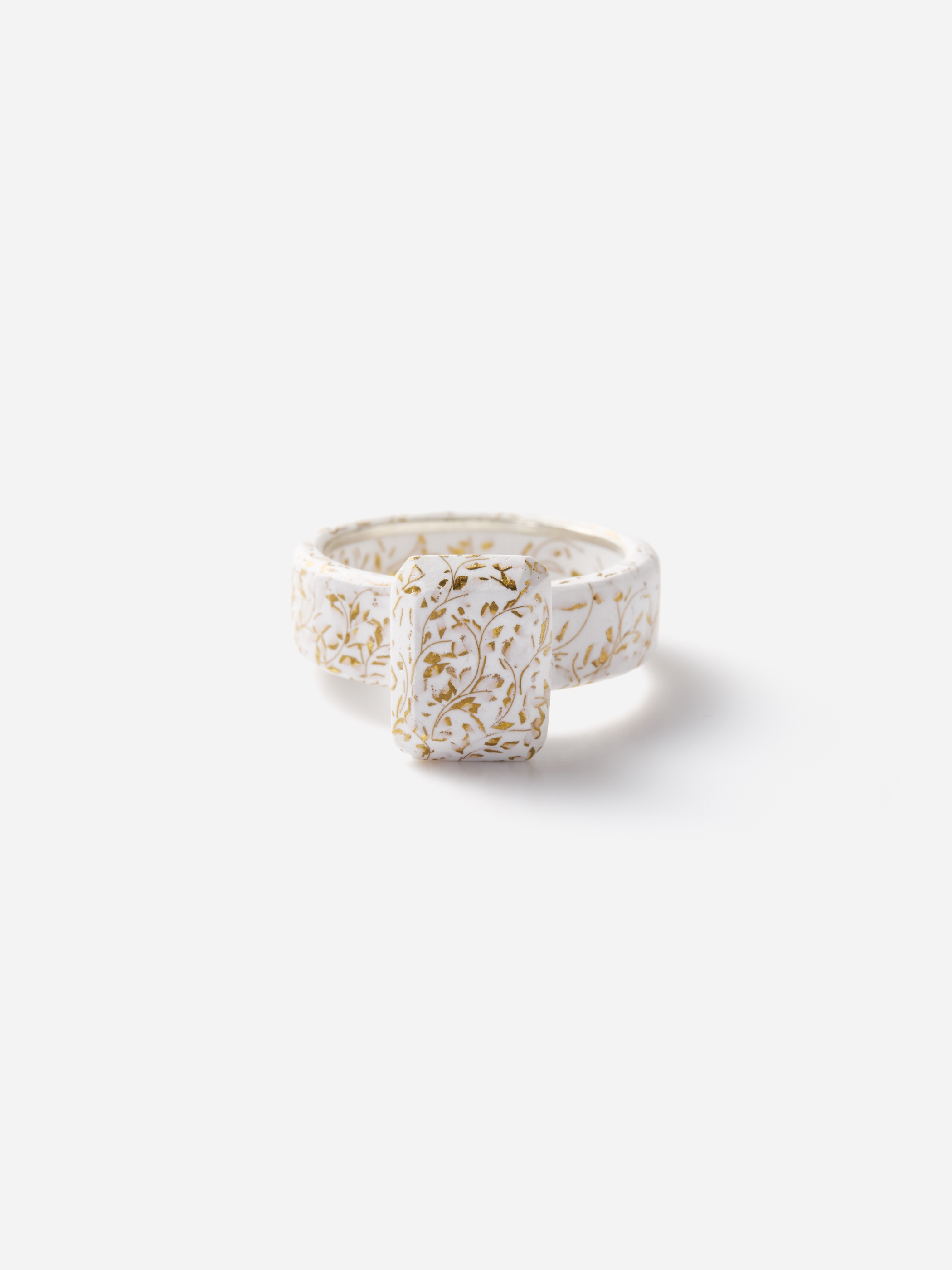 リング全体に白い七宝の釉薬が施され、ゴールドの有線七宝で描かれているのはアラベスク模様のようなパターン。直線的なフォルムと繊細で有機的な文様のコントラストがユニークな意外性を生み出しています。