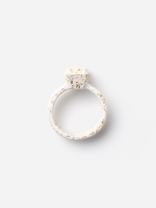 時が静止したかのように白と装飾で包み込まれたリングはまるでアートピースのような存在感です。工芸の緻密な手仕事を、軽やかにモードに表現するMari Kobayashiらしいジュエリーは必見です。