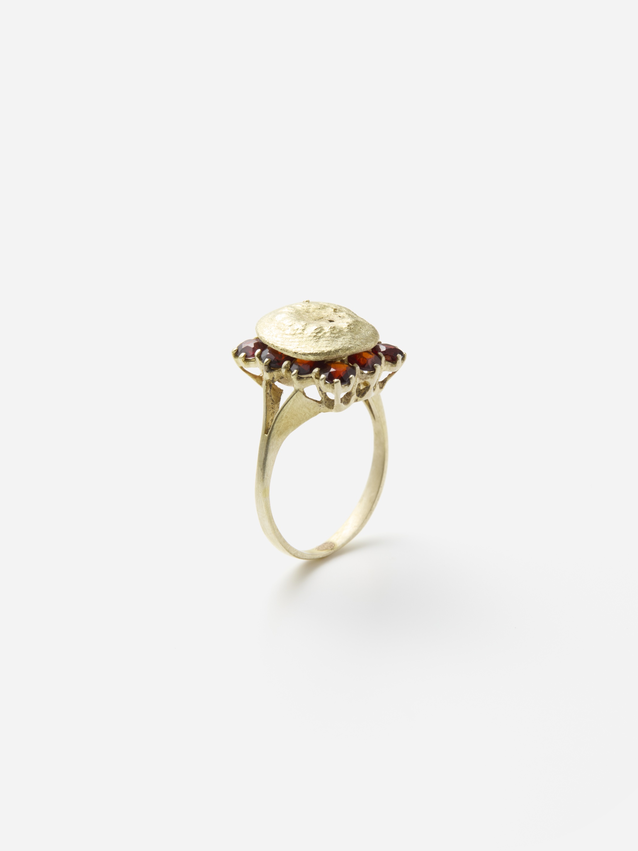 カール・フリッチらしい特徴的な手びねりのパーツがクラシカルなアンティークリングにユーモアを添えるこちらのリング。大胆なフォルムが多いカール・フリッチのリングの中でシンメトリーに近いデザインが目を惹きます。ゴールドとガーネットの赤が手元を明るく照らし、華やかな印象へ導きます。