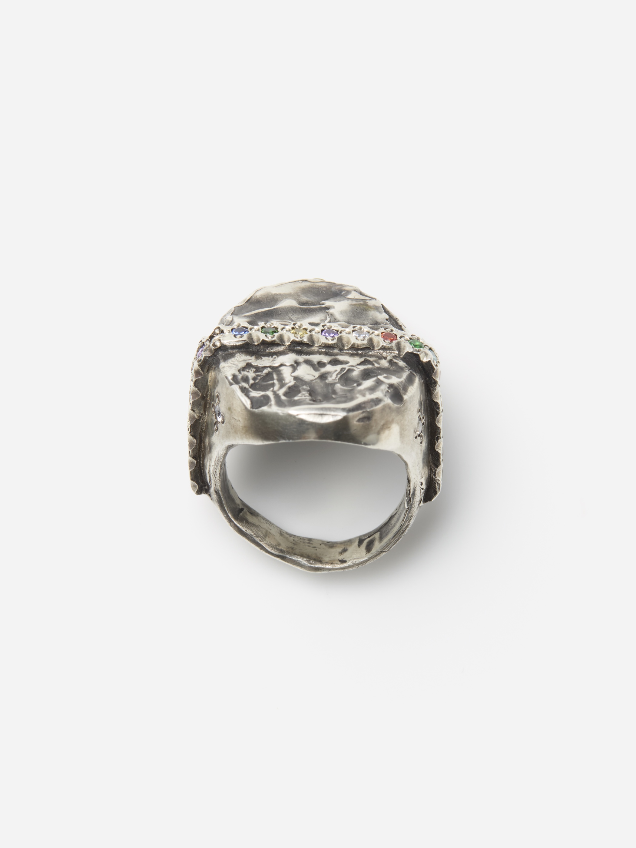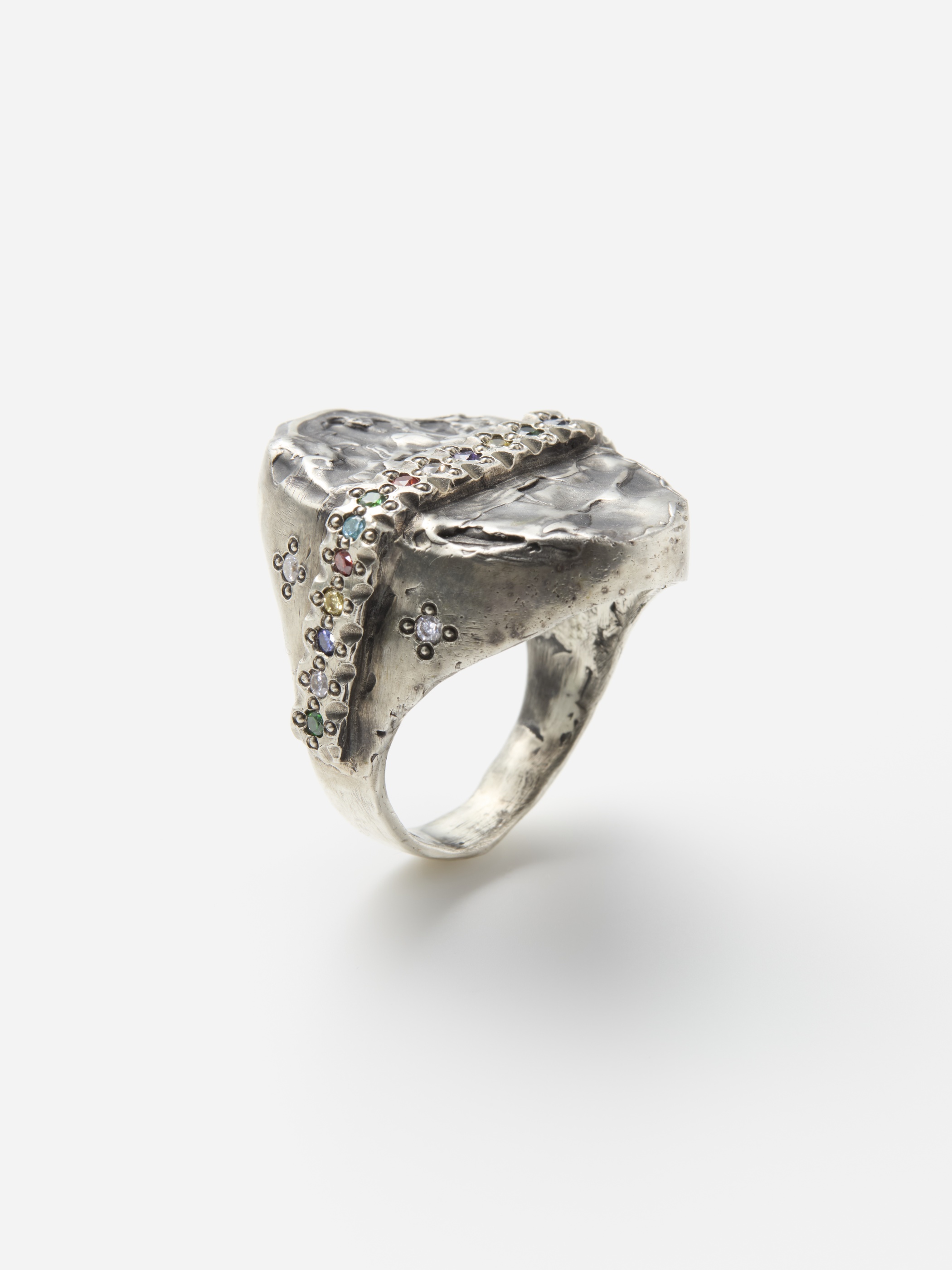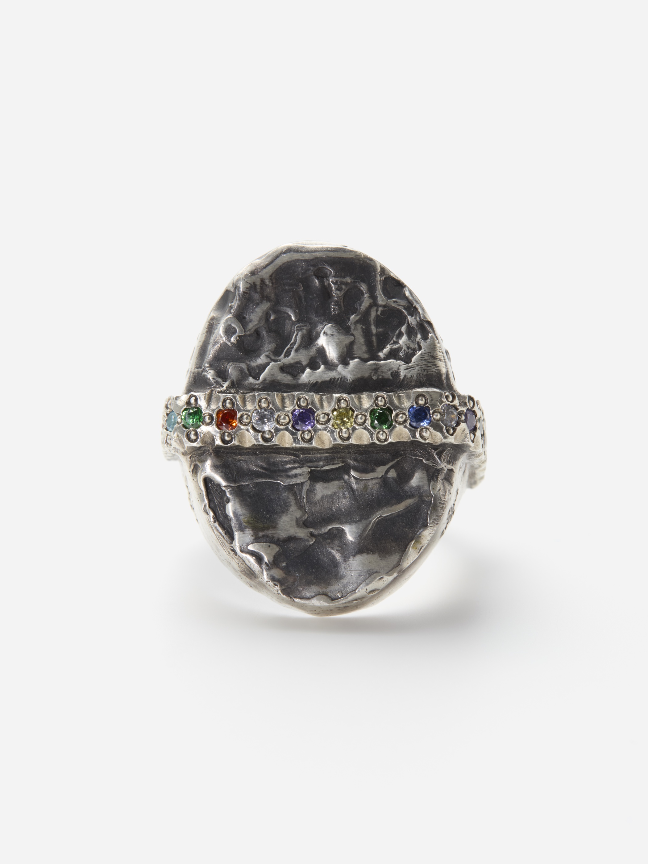 マックス・ウォーカーによるロストワックス鋳造法で作られたリングは、あえてラフさを残した表面仕上げと揺らぎのある形が特徴。oxidized silverの黒い輝きと帯状に並んだカラフルなジルコニアの組み合わせのバランスが印象的です。パンクな要素と作家による手仕事の魅力の両面を兼ね備えた、雰囲気のある世界観を作り出しています。