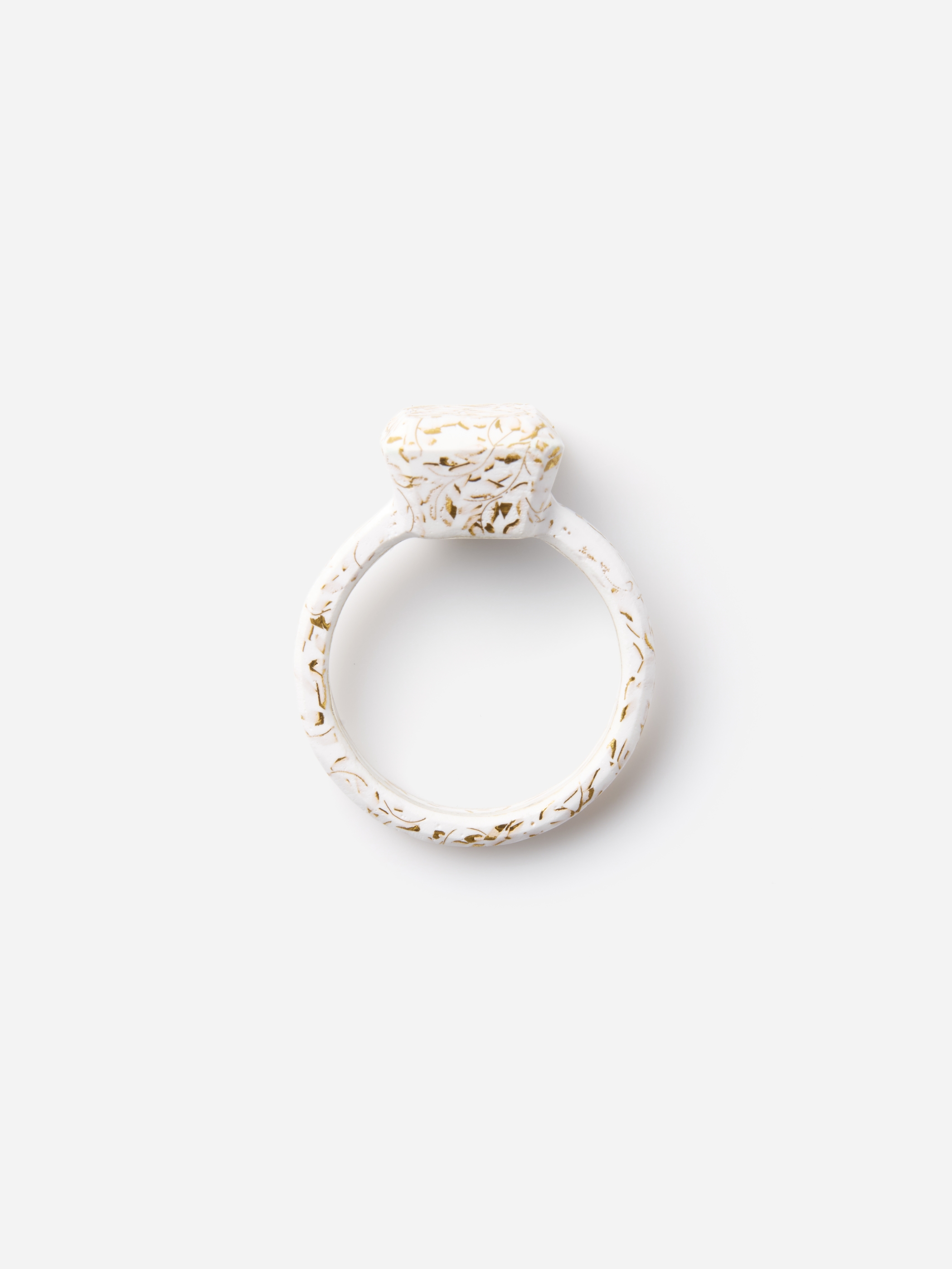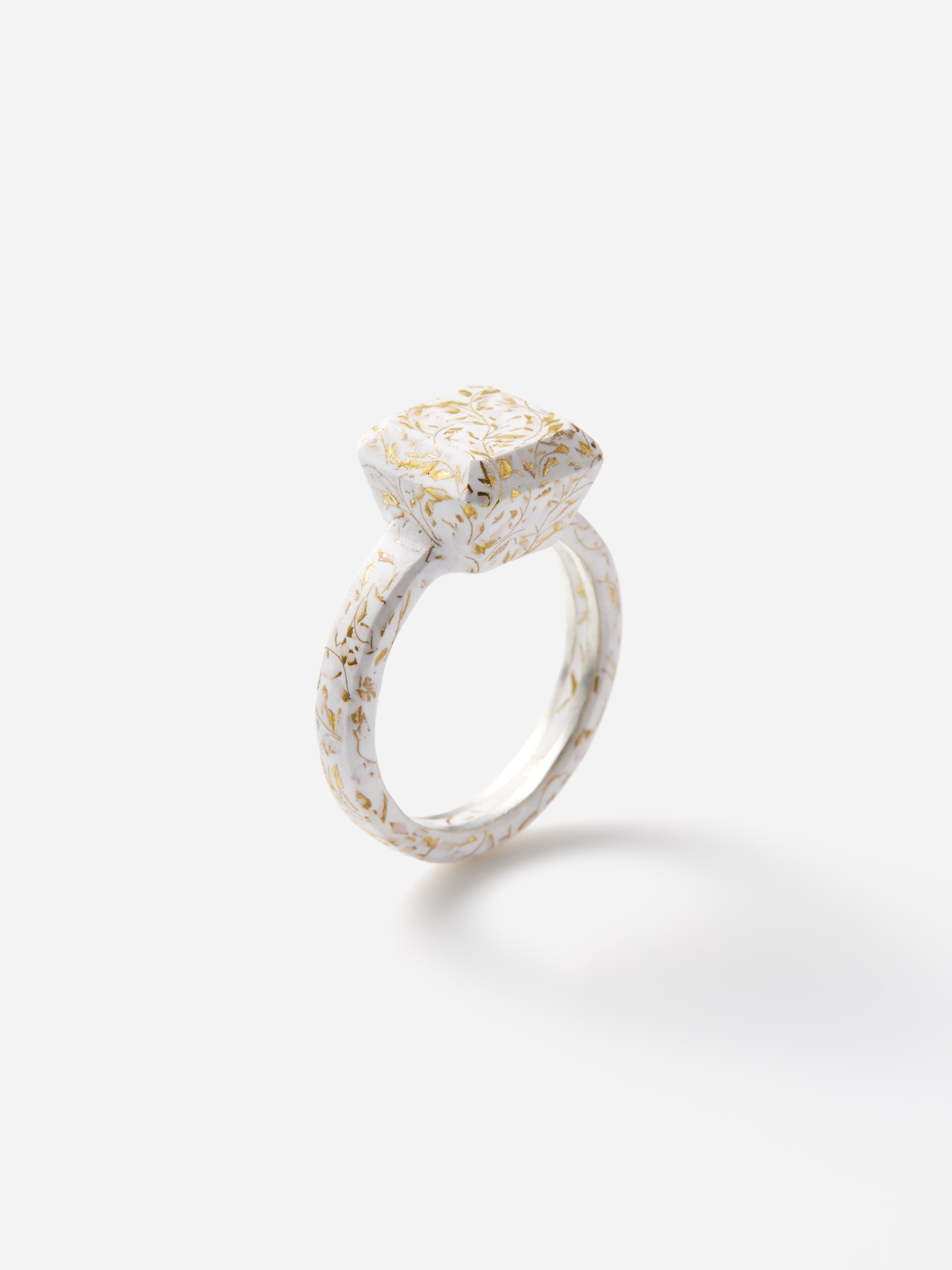 リング全体に白い七宝の釉薬が施され、ゴールドの有線七宝で描かれているのはアラベスク模様のようなパターン。直線的なフォルムと繊細で有機的な文様のコントラストがユニークな意外性を生み出しています。