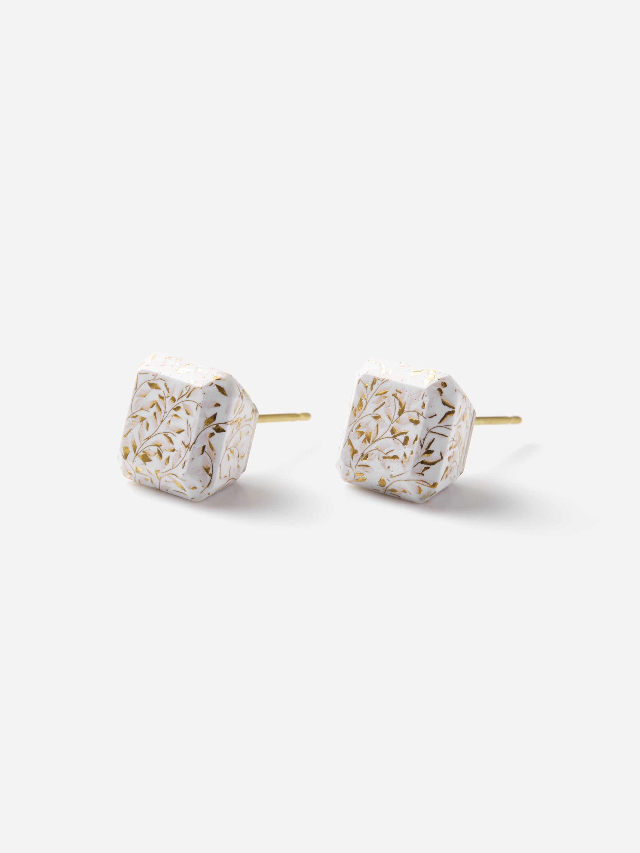 コロンとした直線的なモチーフ全体に白い七宝の釉薬が施され、ゴールドの有線七宝で描かれているのはアラベスク模様のようなパターン。有線七宝という非常に手間ひまのかかる方法によって描かれる美しい文様と、七宝の焼成と研磨などのプロセスの重なりによって、石の形のモチーフは本物の宝石のように唯一無二の存在となっています。