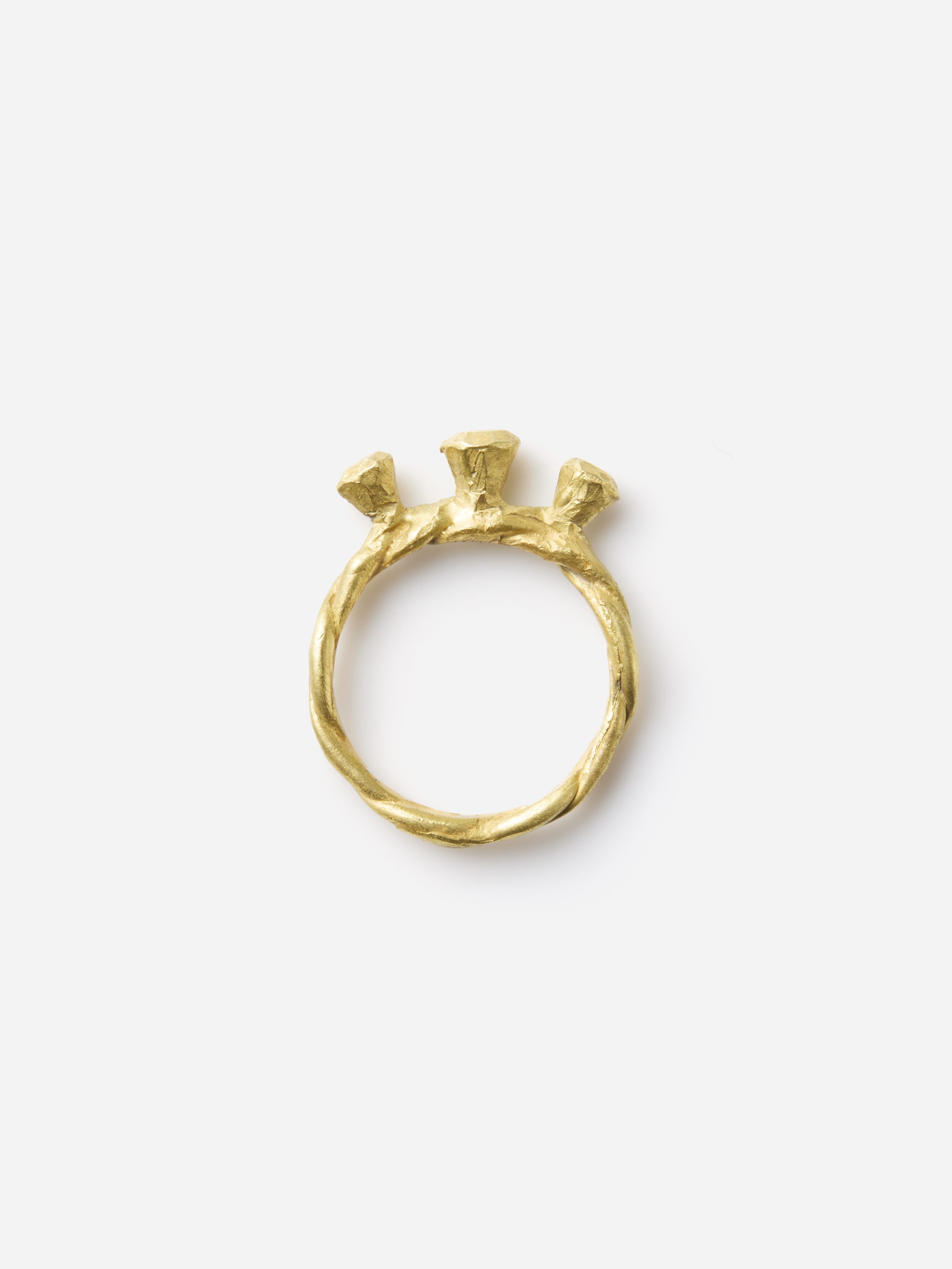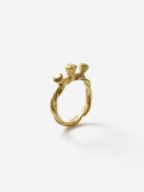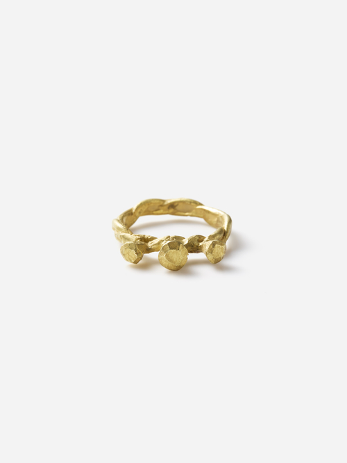 原型となるワックスを手捻りや削りで成形後、K18goldで鋳造。二本の紐を編んだようなアームと石が3つ並んだような遊び心のある形が目を惹きます。フォルムの面白さとソリッドなゴールドそのもの美しさが堪能できる、ラグジュアリーな一点です。
