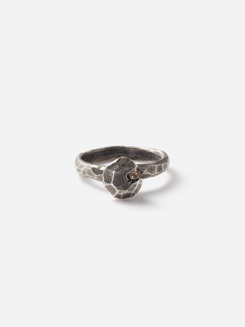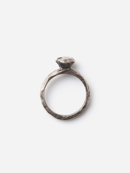 原型となるワックスを大きく面取りすることでソリテールリングの形を削り出し、シルバーで鋳造。ラフさを残したoxidized silverの仕上げに、一点、ダイヤモンドがきらりと輝きを添えます。