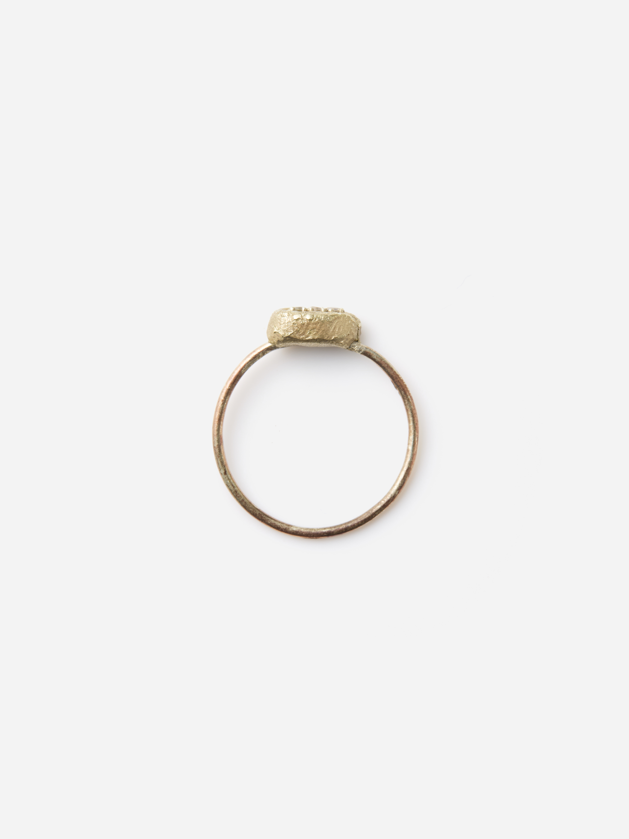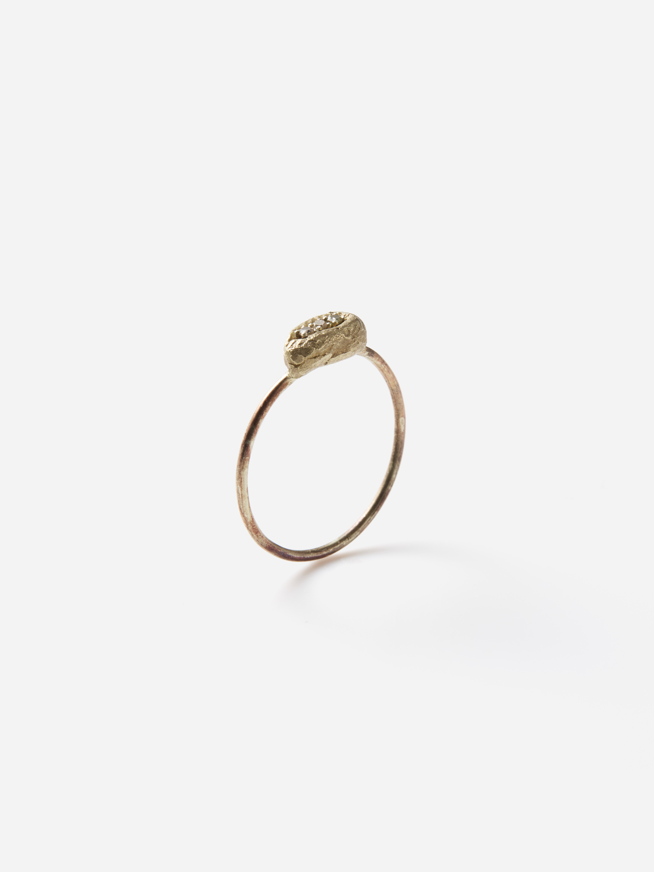 カール・フリッチ作品の中ではめずらしい1mm幅の華奢なアームを用いたこちらのリング。K9とK14のゴールドの組み合わせと、トップに三つ埋め込まれたダイヤモンドの控えめな輝きにはアンティークジュエリーのような雰囲気も感じられます。小さい中にもカールらしい魅力のつまったリングです。