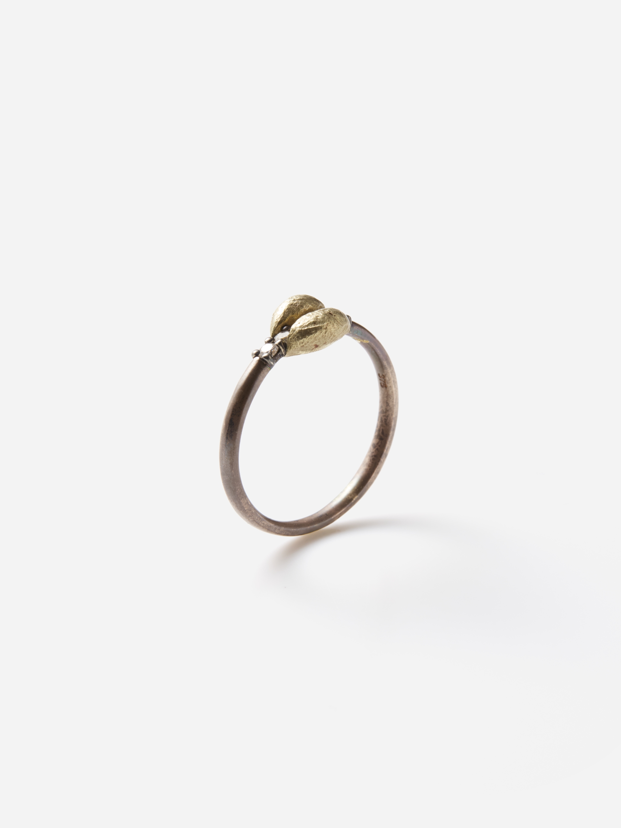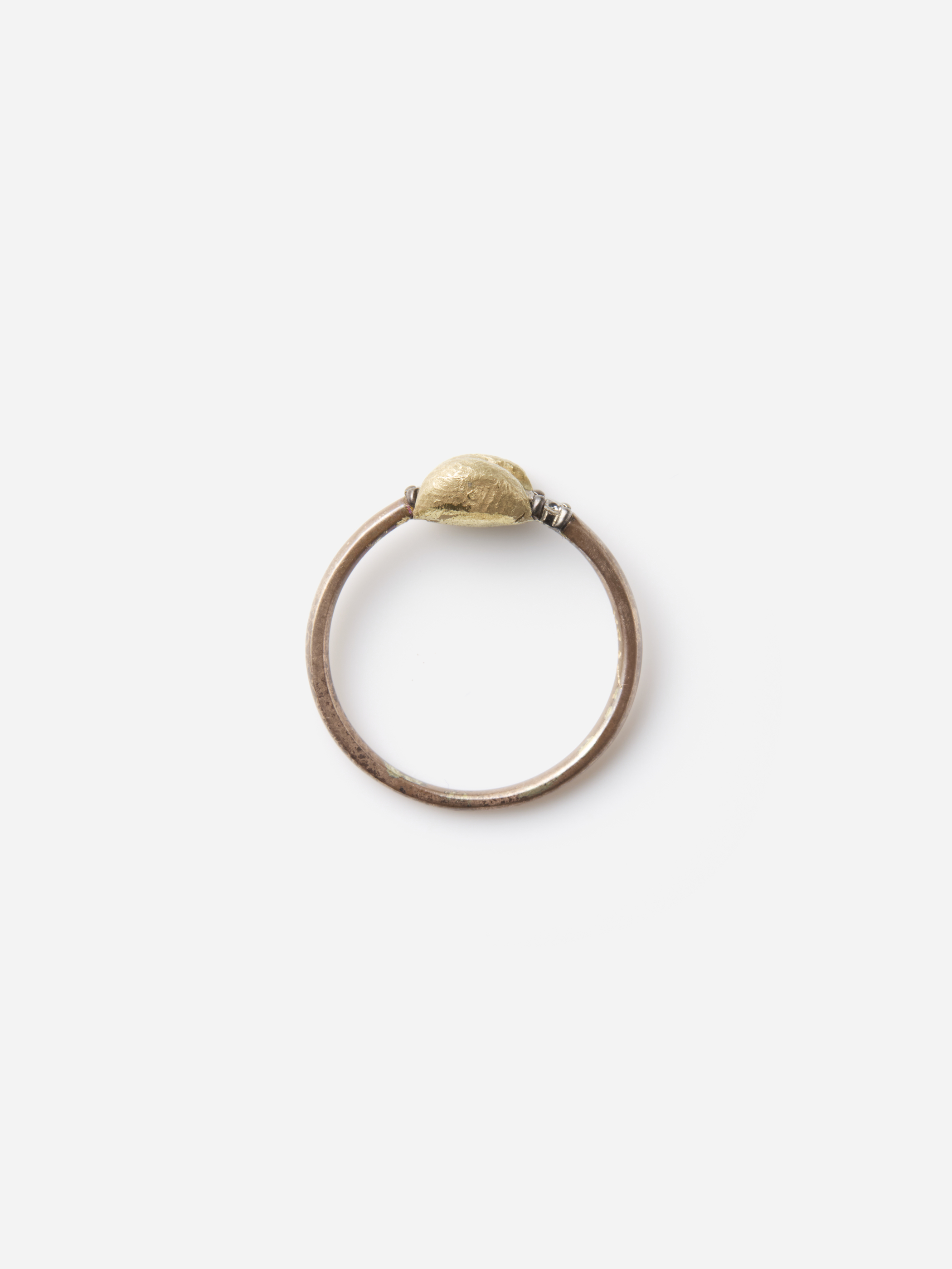 1.5mm幅の華奢なアームをぎゅっと挟んだような、手でこねた形がユニークなバランス感でなんともチャーミング。K9とK14のゴールドの落ち着いた色合いと、トップに5つ並んだダイヤモンドの控えめなきらめきにはアンティークジュエリーのような雰囲気も感じられます。時間が経つ程に愛着が増していきそうなリングです。