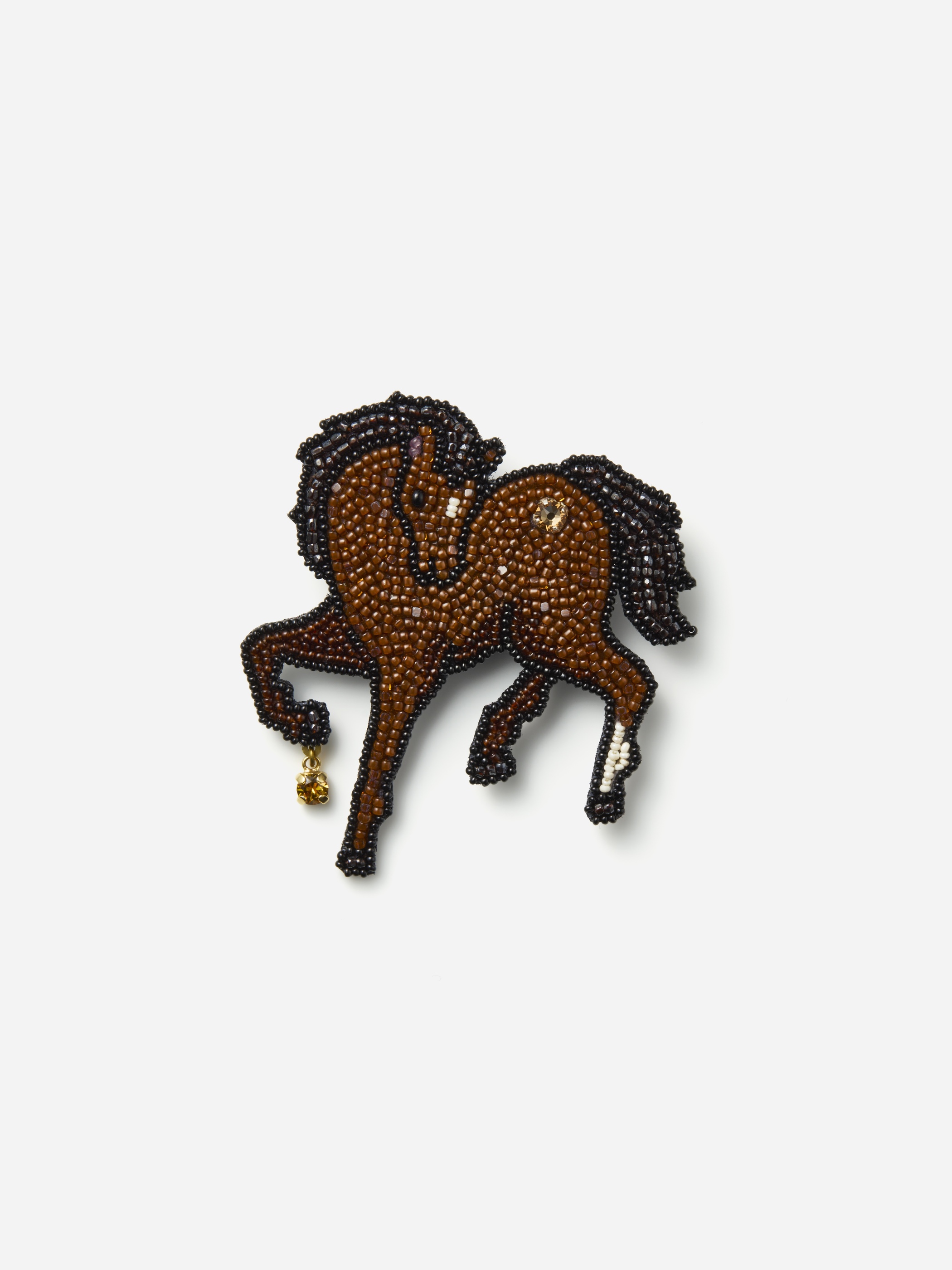 こちらは、いまにも動き出しそうなウマのブローチ。タテガミから尻尾の躍動感まで表現された可愛らしくも力強い作品です。