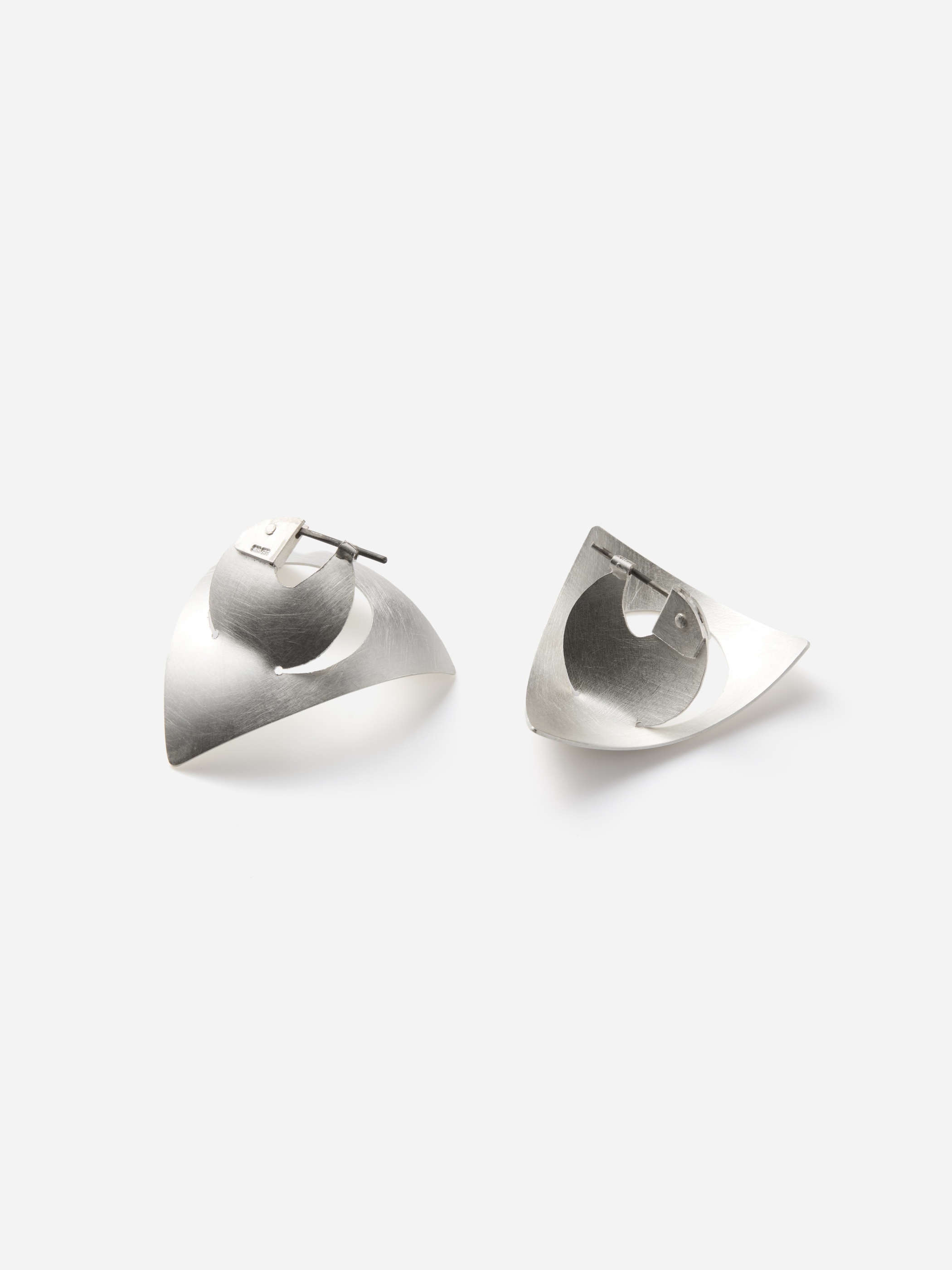 "pull up the silver plate"シリーズは、シルバーのプレートの一部を持ち上げることを起点にデザインが展開しています。こちらは表裏が反転したようなペアのピアス。